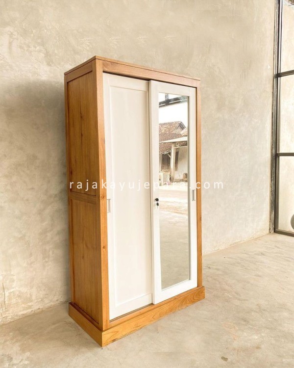 Almari Pakaian Cermin Pintu 2 Kayu Jati Minimalis Natural & Duco Putih RKJ-LMP 08